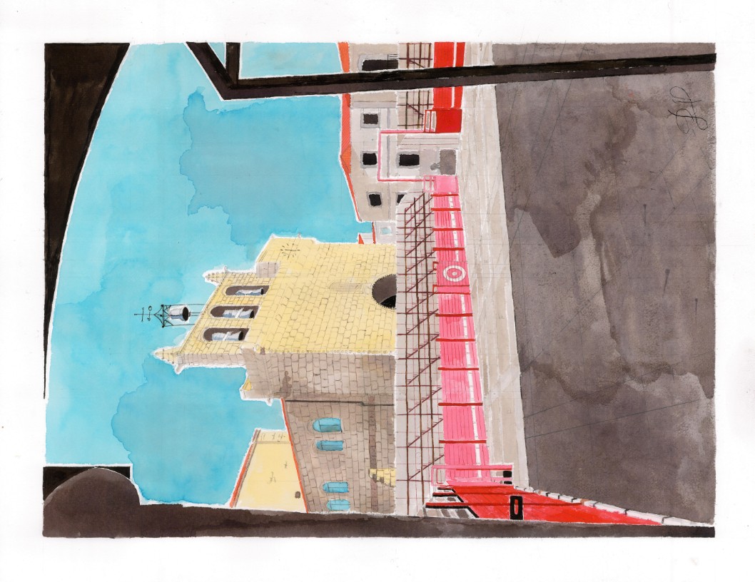 Ce monument central d’un bourg débouche sur une place réquisitionnée l’été pour les fêtes du village. Villavieja de Yeltes (que l’on appelle entre connaisseurs : le village), commune espagnole, possède encore ce qu’a perdu en France mon village d’Heric, même si le premier tend à, malheureusement selon moi, à ressembler au second, peut-être, à l’avenir. Ce tableau, réalisé d’après une photo, résume ce que représente ce village pour certains avec son église. Sa simple église est une cathédrale à leur yeux, et je ne leur donne pas tort de l’acquiescer quand je le prétend devant eux. C’est le mot “Cathédrale” orthographié dans la langue du pays où est situé ce “village”. Villavieja de Yeltes, Salamanca, España. Ce tableau associé à “QG”, “Plaza major” et “café con hielo” composera un quadriptyque intitulé “le village“